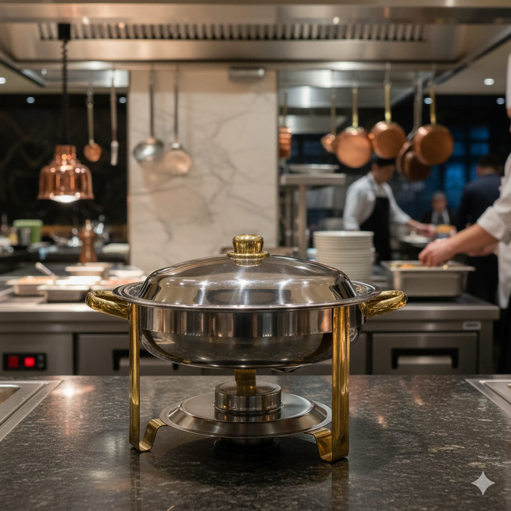 Description: Malibu Chafer, 4 qt., round, stainless steel, mirror finish cover, gold accents, includes food pan, water pan, and fuel holder