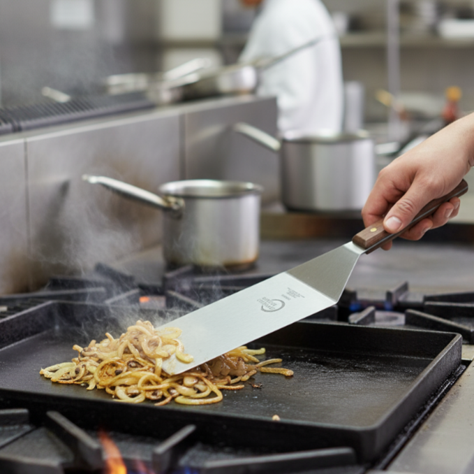 Description: Praxis® Turner, 8" x 4", 16" overall length, heavy duty, high carbon, Japanese stainless steel blade, rosewood handle with (3) brass compression rivets