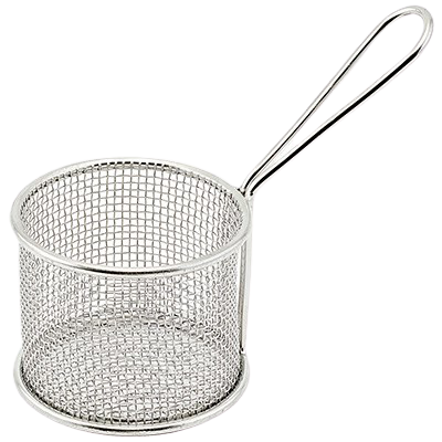 Description: Mini Fry Basket, 3-3/4" dia. x 2-7/8"H, round, dishwasher safe, 18/8 stainless steel