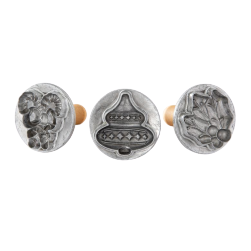 Description: Holiday Cookie Stamp 3D Cut-Outs, Cast Aluminum with wood handles, Makes 3 different cut-out designs