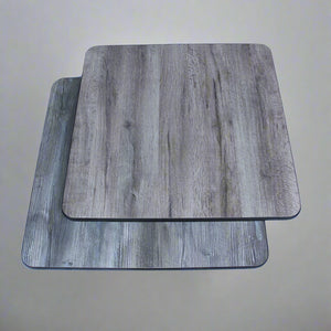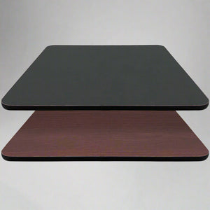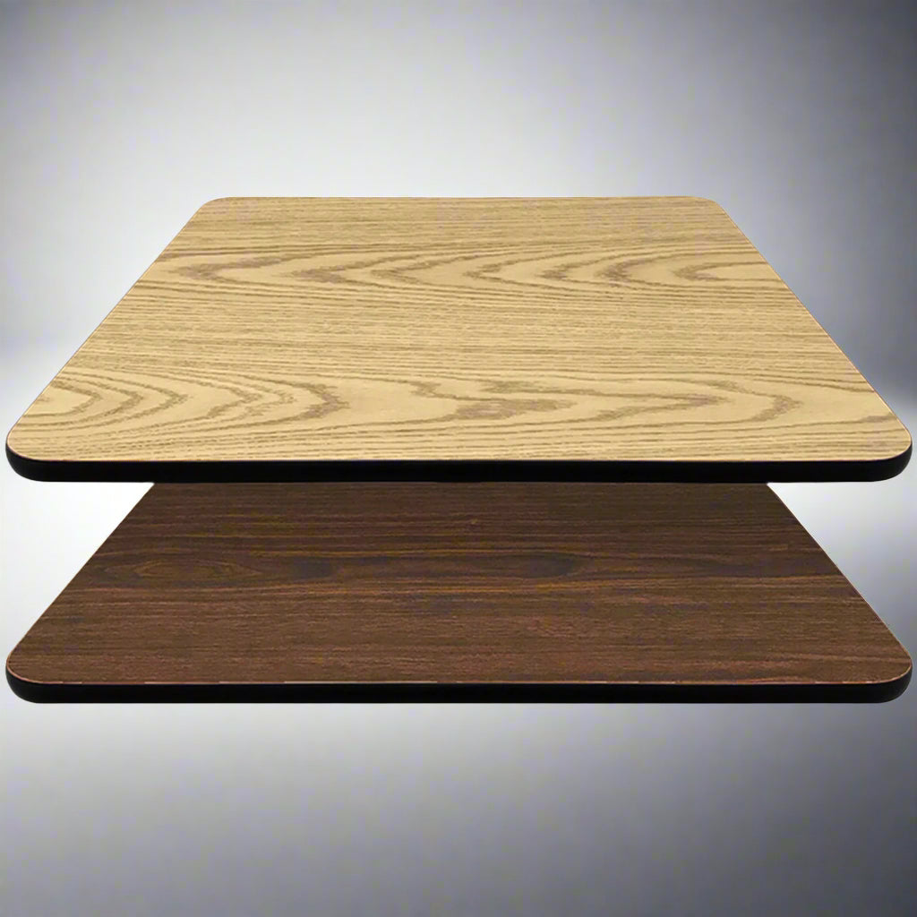 Description: Reversible Table Top, rectangular, 30" x 48", 1" thick, melamine surface, extruded brown rubber T-mold edge, industrial grade particle board, oak/walnut, top is CARB-Compliant Phase 2 for California, Quick Ship