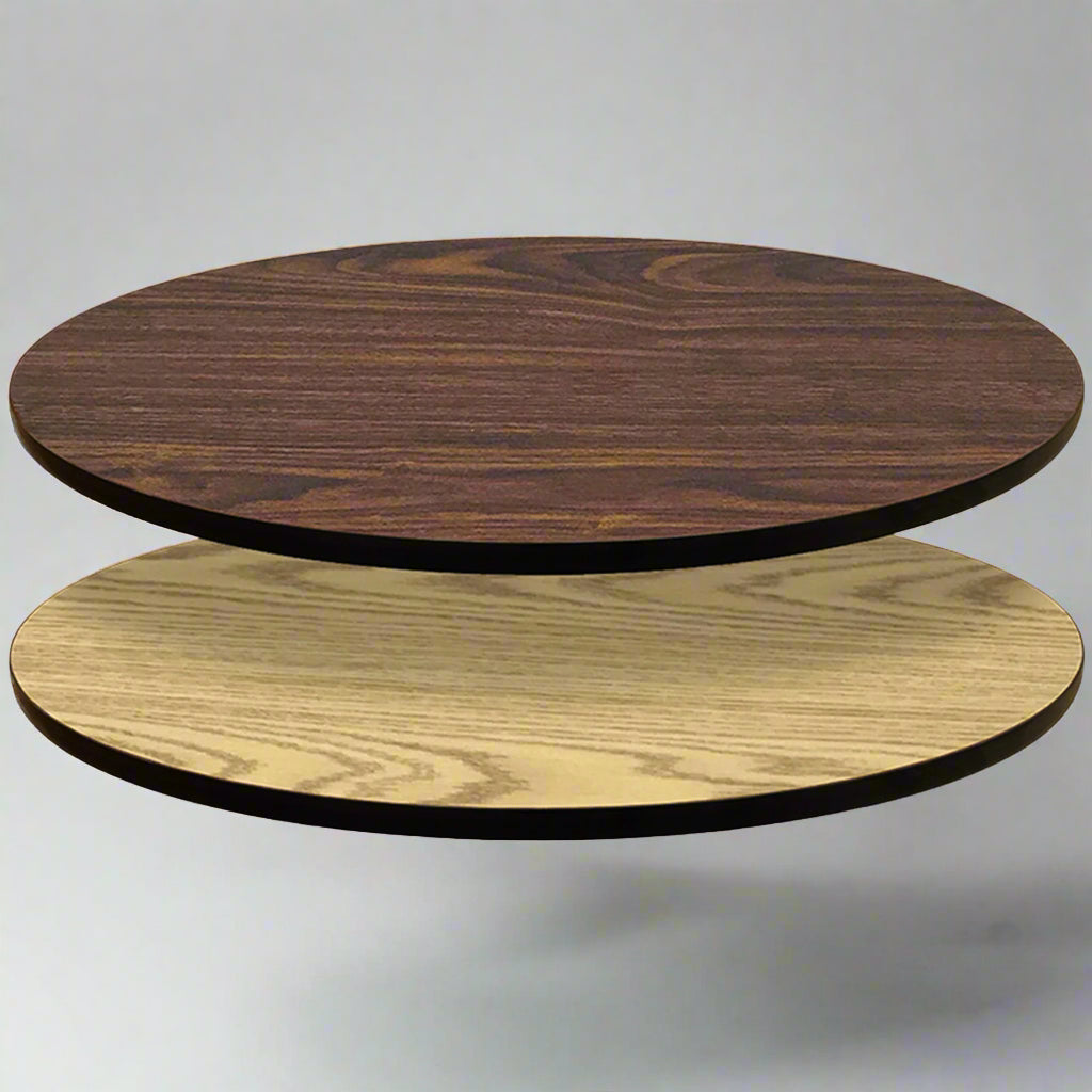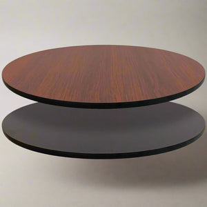 Description: Reversible Table Top, round, 36" dia., 1" thick, melamine surface, extruded brown rubber T-mold edge, industrial grade particle board, oak/walnut, top is CARB-Compliant Phase 2 for California, Quick Ship