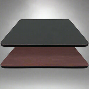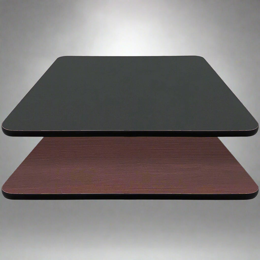 Description: Reversible Table Top, rectangular, 30" x 60", 1" thick, melamine surface, extruded black rubber T-mold edge, industrial grade particle board, mahogany/black, top is CARB-Compliant Phase 2 for California, Quick Ship