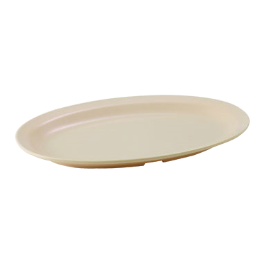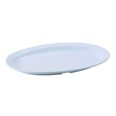 Description: Platter, 13" x 8-1/2", oval, narrow rim, heat resistant up to 212°F/100°C, dishwasher safe, melamine, white, NSF