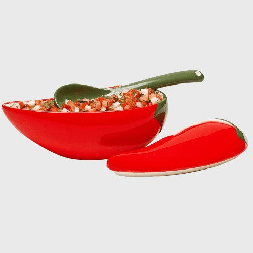 Description: Adorn the serving tray with an pepper shaped dipping bowl. 1.5 cup capacity. Includes bowl, lid and 7 inch serving spoon. Dishwasher safe.