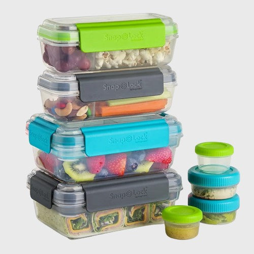 Description: Includes 2 SnapLock 2-Tbsp. Dressing Containers, 2 SnapLock Divided Bento Containers, 2 SnapLock 4 Tbsp. Dressing Containers, and 2 SnapLock Divided Snack Box Containers. Perfect for travel, work, and on-the-go meal options. The total dressing or liquid container capacity is 6 ounces, and the total capacity for the additional bento/hinged-lid containers is 10 cups. The 2 and 4 Tbsp. dressing containers are leak-resistant and compact and the Bento and Snack Containers include divider trays for multiple snack options and hinged lids. All of the containers are leak-resistant for convenient, on-the-go storage. All containers are Phthalate and BPA-free, as well as, microwave, freezer, and dishwasher safe.