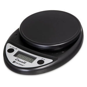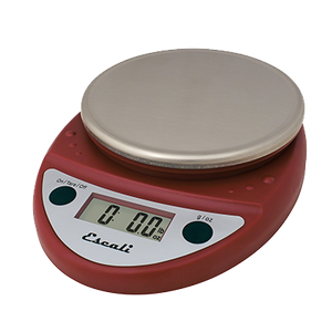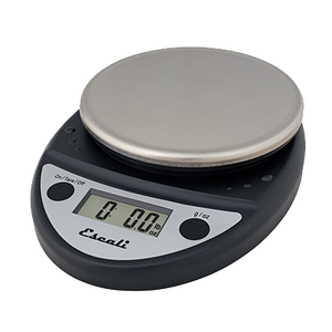 Description: Escali Primo Digital Scale, round, 6"W x 8-1/2"D x 1-3/5"H overall, 5-1/2" dia. stainless steel removable platform, 11 lb. x 0.1 oz./ 5 kg x 1g, measures in grams, pounds + ounces & ounces, tare feature, two-button operation, automatic shut-off, compact & portable, (2) AA batteries included, metallic finish, NSF
