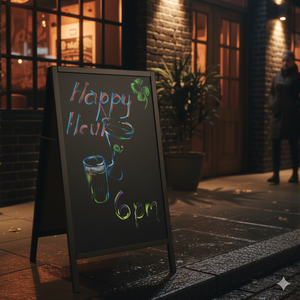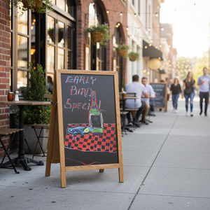 Description: Sidewalk Marker Board, dual-sided, overall dimensions 26-1/4"L x 2"W x 45"H luxury, black board, 1-1/4"W wood frame, includes (2) standard markers (white and yellow), (4) deluxe plus markers (green, red, blue, and orange), (1) easy wipe eraser, premium white oak