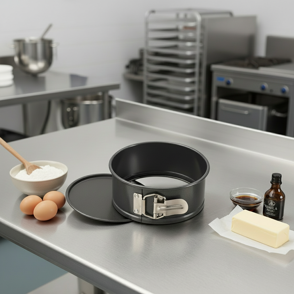 Description: Bakeware Springform Pan, 6" dia. x 2-3/4" deep, round, heat tolerant to 500°F/260°C, reinforced rim, dishwasher safe, PTFE/PFOA-free, Quantum2® non-stick coating, 0.6 mm/24 gauge aluminized steel (bottom)