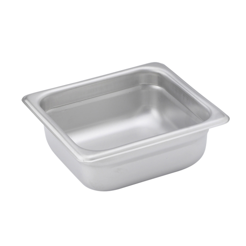 Description: Steam Table Pan, 1/6 size, 6-7/8" x 6-5/16" x 2-1/2" deep, 24 gauge, anti-jamming, 18/8 stainless steel, NSF