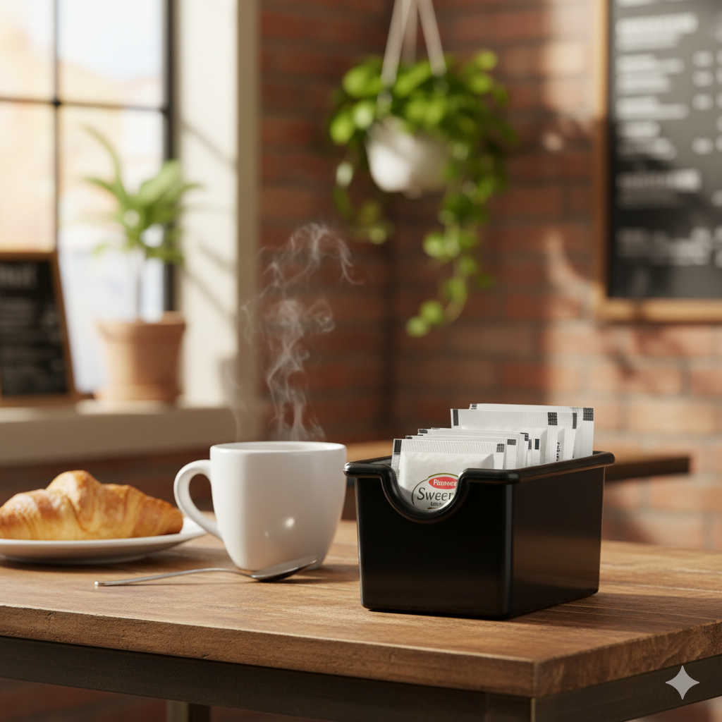 Description: Sugar Packet Holder, 3-1/2" x 2-1/2" x 2"H, plastic, black, NSF