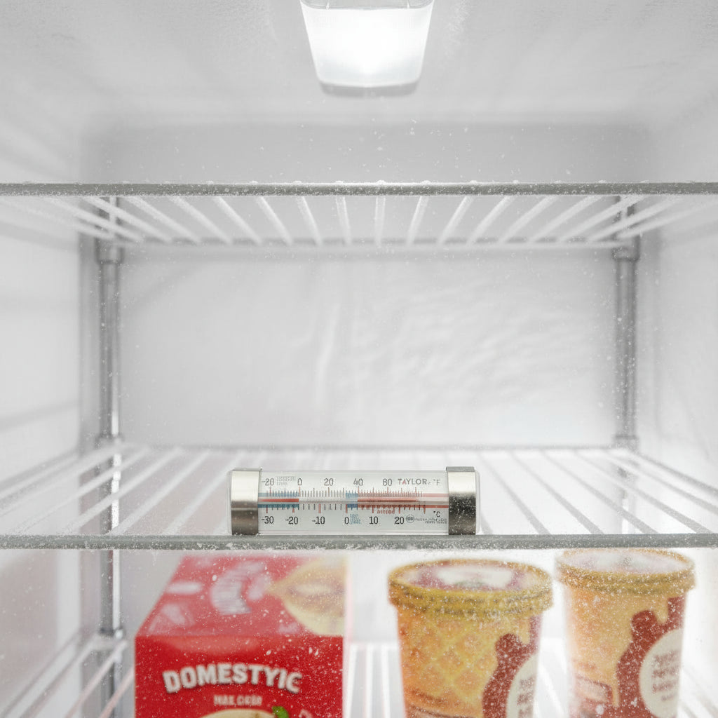 Description: Refrigerator/Freezer Thermometer, -20° to 80°F (-30 to 30°C) temperature range, safe temperature zone indicators, magnified face, shatterproof, clear plastic lens protects glass tube, non-toxic filling, hangs or stands, NSF