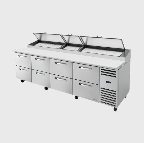 Description: SPEC SERIES® Pizza Prep, SPEC Package 3 includes: stainless steel cover, 33 - 41°F pan rail, 19-1/2"D cutting board, (8) drawers with locks, accommodates (2) 12" x 20" x 8"D pans (NOT included), includes: (15) 1/3 size clear polycarbonate insert pans (top), stainless steel front, sides & back, stainless steel liner & stainless steel floor with coved corners, front breathing, R290 Hydrocarbon refrigerant, 3/4 HP, 115v/60/1-ph, 7.1 amps, NEMA 5-15P, UL EPH Classified, cULus, CE, Made in USA
