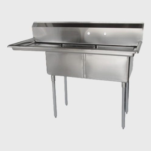 Description: Sink, 2-compartment, with 18" left-hand drainboard, 18" front-to-back x 18" wide sink compartments, 11" deep bowls, 11"H backsplash, 18/304 stainless steel bowls, galvanized gussets & tubular legs with adjustable ABS feet, NSF