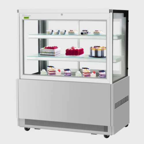 Description: Refrigerated Bakery Display Case, 47-1/4"W x 27-1/2"D x 51-7/8"H, 17.2 cu. ft. capacity, self-contained refrigeration with self-cleaning condenser, front glass opening, tempered glass side pannels, sliding rear doors, digital temperature controller, (2) adjustable tempered glass shelves with AL front & back edges, LED interior lighting, stainless steel exterior, 3" swivel casters (rear locking), R290 Hydrocarbon refrigerant, 3/4 HP, 115v/60/1-ph, 8.2 amps, cord with NEMA 5-15P, cETLus, ETL-Sanitation