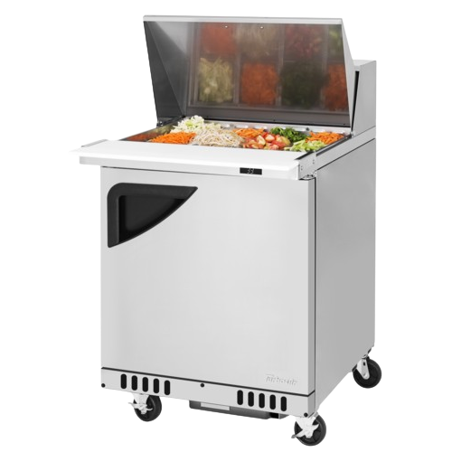Description: Super Deluxe Sandwich/Salad Mega Top Unit, Front Breathing airflow, one-section, 27-1/2"W x 37"D x 39"H, 7.4 cu. ft. capacity, stainless steel top with 12-pan opening, (1) stainless steel door with recessed handle, stainless steel interior & exterior (galvanized steel back & bottom), ABS door liner, (1) stainless steel wire shelf, LED interior lighting, self-cleaning condenser equipped, cold air compartment, insulated pan cover, cutting board side rail, hot gas condensate system, self-contained rear mounted refrigeration system, R290 Hydrocarbon refrigerant, 1/5 HP, 115v/60/1-ph, 3.8 amps, NEMA 5-15P, cETLus, ETL-Sanitation (contact sales for lead time)