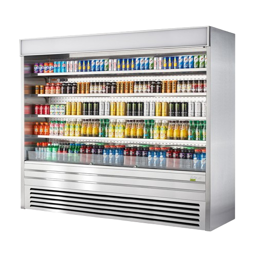 Description: Vertical Air Curtain Open Display Merchandiser, 45.2 cu. ft. capacity, 92-7/8"W x 29-7/8"D x 81-1/8"H, self-contained refrigeration with self-cleaning condenser, LED interior lighting, (8) adjustable shelves, night curtain, front air intake & rear air discharge, stainless steel interior & exterior, R290 Hydrocarbon refrigerant, (4) 3/4 HP, 220v/60/1-ph, 18.0 amps, cord with NEMA 6-20P, CSA-Sanitation, cCSAus