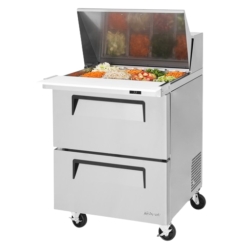 Description: Super Deluxe Sandwich/Salad Mega Top Unit, one-section, 27-1/2"W x 37"D x 44-34"H, 7.0 cu. ft. capacity, stainless steel top with 12-pan opening, (2) drawers, stainless steel interior & exterior (galvanized steel back & bottom), ABS door liner, (1) stainless steel wire shelf, LED interior lighting, self-cleaning condenser equipped, cold air compartment, insulated pan cover, cutting board side rail, hot gas condensate system, self-contained rear mounted refrigeration system, R290 Hydrocarbon refrigerant, 5-3/4" casters, 1/5 HP, 115v/60/1-ph, 3.8 amps, NEMA 5-15P, cETLus, ETL-Sanitation, (contact factory for lead time)