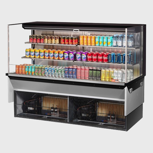 Description: Drop-In Horizontal Open Display Case, low profile, 23.4 cu. ft. capacity, 71-7/8"W x 33"D x 52-1/2"H, self-contained refrigeration with self-cleaning condenser, (2) tiers with (4) glass shelves + deck, tempered glass front shield & side walls, solar digital thermometer, digital electronic thermostat with defrost control, LED interior lighting, stainless steel interior, back wall & deck pan, specify exterior color, front air intake & rear air discharge, includes night cover, R290 Hydrocarbon refrigerant, (4) 3/4 HP, 220v/60/1ph, 13.0 amps, cord with NEMA 6-20P, cETLus, ETL-Sanitation (Contact sales for lead time)