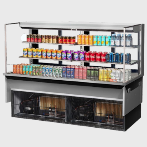 Description: Drop-In Horizontal Open Display Case, low profile, 23.4 cu. ft. capacity, 71-7/8"W x 33-3/4"D x 52-1/2"H self-contained refrigeration with self-cleaning condenser, (2) tier with (4) glass shelves + deck, tempered glass front shield & side walls, rear sliding glass doors, solar digital thermometer, digital electronic thermostat with defrost control, LED interior lighting, stainless steel interior & exterior, front air intake & rear air discharge, includes night cover, R290 Hydrocarbon refrigerant, (4) 3/4 HP, 220v/60/1-ph, 13.0 amps, cord with NEMA 6-20P, cETLus, ETL-Sanitation (Contact sales for lead time)