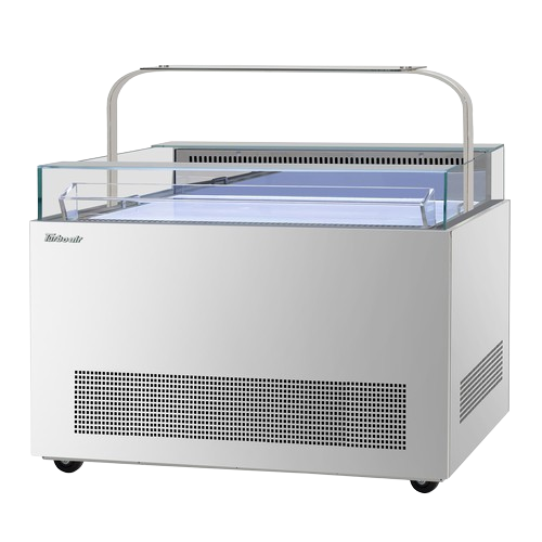 Description: Open Display Sandwich & Cheese Merchandiser, with glass sneeze guard, 50-1/4"W x 35-3/8"D x 40-1/4"H, 2.35 cu. ft., capacity, self-contained refrigeration with self-cleaning condenser, digital temperature controller, single pane tempered glass, bottom lit LED interior lighting, glass top shelf with stainless steel frame, stainless steel exterior, deck & airflow grille, 3" swivel casters (2 with brakes), R290 Hydrocarbon refrigerant, 1/3 HP, 115v/60/1ph, 8.0 amps, cord with NEMA 5-15P, cETLus, ETL-Sanitation