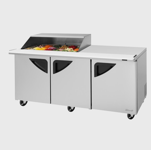 Description: Super Deluxe Sandwich/Salad Mega Prep + Work Station with Slide-Back Lid, specify side for work station, three-section, 23 cu. ft. capacity, self-contained refrigeration, 72-5/8"W x 34"D x 39-5/8"H, (18) 1/6 size x 4" deep pan capacity, (3) solid doors, (3) stainless steel shelves, LED interior lighting & fan control, digital temperature control & monitor system, LED interior lighting & fan control, Insulated pan cover, 9-1/2" deep & 1/2" thick cutting board included with convenient side rail, stainless steel interior (ABS door liner), stainless steel exterior (galvanized steel back & bottom), self cleaning condenser, R290 Hydrocarbon refrigerant, 3/8 HP, 115v/60/1-ph, 9.9 amps, cord with NEMA 5-15P, ETL-Sanitation, cETLus, MADE IN USA (Contact sales for lead time)