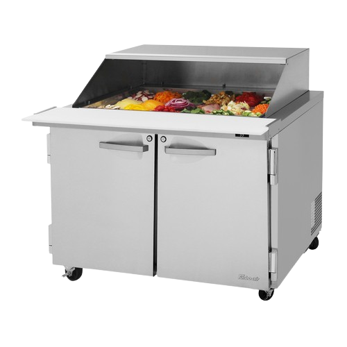 Description: PRO Series Mega Top Sandwich/Salad Prep Table with Slide Lid, two-section, rear mount self-contained compressor, 15.0 cu. ft., 18-pan top opening with hood, (2) solid hinged swing doors with locks, aluminum door liner, (2) stainless steel shelves, 9-1/2" deep cutting board with side rail, digital temperature control & monitor system, cold bunker system, stainless steel interior & exterior (galvanized bottom), LED interior lighting & fan control, self-cleaning condenser, R290 Hydrocarbon refrigerant, 1/5 HP, 115v/60/1-ph, 6.5 amps, NEMA 5-15P, cETLus, ETL-Sanitation, Made in USA (contact factory for lead time)