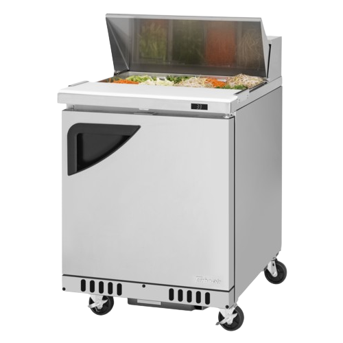 Description: Super Deluxe Sandwich/Salad Unit, Front Breathing airflow, one-section, 6.5 cu. ft., 27-1/2"W x 30"D x 37"H, stainless steel top with 8-pan opening, (1) stainless steel door with recessed handle, stainless steel interior & exterior (galvanized steel back & bottom), ABS door liner, (1) stainless steel wire shelf, self-cleaning condenser equipped, cold air compartment, insulated pan cover, cutting board side rail, hot gas condensate system, self-contained rear mounted refrigeration system, R290 Hydrocarbon refrigerant, 1/5 HP, 115v/60/1-ph, 3.8 amps, NEMA 5-15P, cETLus, ETL-Sanitation (contact sales for lead time)