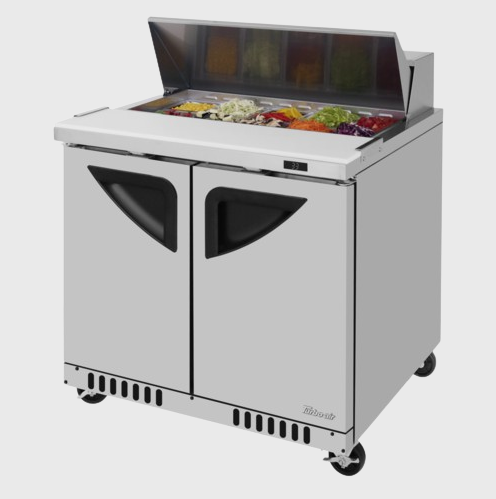 Description: Super Deluxe Sandwich/Salad Unit, front breathing airflow, two-section, 8.8 cu. ft., 36-1/4"W x 30"D x 37"H, stainless steel top with 10-pan opening, (2) solid hinged swing doors, stainless steel interior & exterior (galvanized steel back & bottom), (2) stainless steel wire shelf, self-cleaning condenser equipped, cutting board side rail, R290 Hydrocarbon refrigerant, 1/5 HP, 115v/60/1-ph, 3.8 amps, NEMA 5-15P, cETLus, ETL-Sanitation (contact sales for lead time)