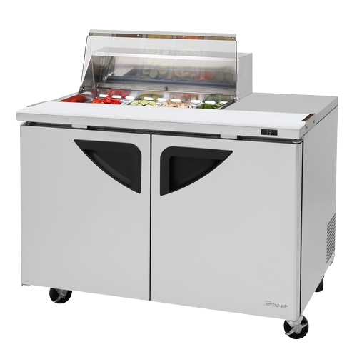 Description: Super Deluxe Sandwich/Salad Unit, two-section, 15.0 cu. ft., clear top with 8-pan opening, (2) stainless steel doors with recessed handles, ABS door liner, (2) stainless steel shelves, cold air compartment, 9-1/2"D cutting board, digital temperature control & monitoring system, LED interior lighting & fan control, stainless steel interior & exterior (galvanized steel back & bottom), 5-3/8"H casters, self-cleaning condenser equipped, R290 Hydrocarbon refrigerant, 1/5 HP, 115v/60/1-ph, 6.5 amps, cord, NEMA 5-15P, cETLus, ETL-Sanitation. Made in USA (allow 4 weeks lead time)