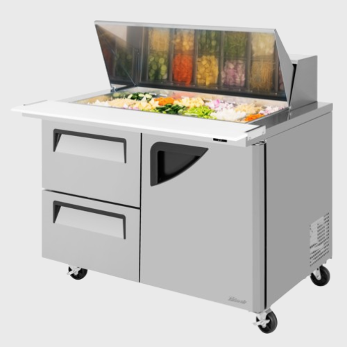 Description: Super Deluxe Sandwich/Salad Mega Top Unit, two-section, 48-1/4"W x 34"D x 39"H, 15 cu. ft., stainless steel top with 18-pan opening, (2) drawers on left, (1) right hinged door on right, stainless steel interior & exterior (galvanized steel back & bottom), digital temperature control & monitoring system, ABS door liner, (1) stainless steel wire shelves, LED interior lighting, self-cleaning condenser equipped, cold air compartment, insulated pan cover, cutting board side rail, cold bunker system, self-contained rear mounted refrigeration system, R290 Hydrocarbon refrigerant, 1/5 HP, 115v/60/1-ph, 6.5 amps, NEMA 5-15P, cETLus, ETL-Sanitation (contact sales for lead time)
