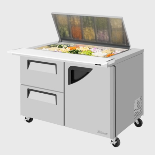Description: Super Deluxe Mega Top Sandwich/Salad Prep Table with Flat Lid, two-section, rear mount self-contained compressor, 15 cu. ft., 48-1/4"W x 34"D x 32-7/8"H, 18-pan top opening with lid, (1) solid hinged swing door, (2) drawers, 9-1/2" deep cutting board, digital temperature control & monitor system, cold bunker system, stainless steel interior & exterior (galvanized bottom), self-cleaning condenser, R290 Hydrocarbon refrigerant, 1/5 HP, 115v/60/1-ph, 6.5 amps, NEMA 5-15P, cETLus, ETL-Sanitation (contact sales for lead time)