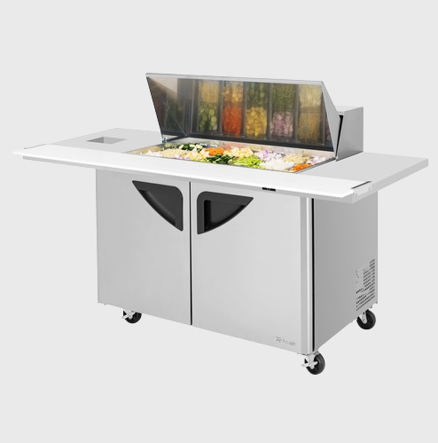 Description: Super Deluxe Sandwich/Salad Mega Top Unit, Extended Countertop, 72-5/8"L x 34"D x 39"H, two-section, 15.0 cu. ft., stainless steel top with 18-pan opening, (2) stainless steel doors with recessed handles, stainless steel interior & exterior (galvanized steel back & bottom), digital temperature control & monitoring system, ABS door liner, LED interior lighting, (2) stainless steel wire shelves, LED interior lighting, self-cleaning condenser equipped, cold air compartment, insulated pan cover, cutting board side rail, cold bunker system, self-contained rear mounted refrigeration system, R290 Hydrocarbon refrigerant, 1/3 HP, 115v/60/1-ph, 4.4 amps, NEMA 5-15P, cETLus, ETL-Sanitation