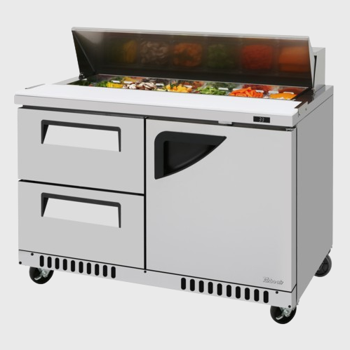 Description: Super Deluxe Sandwich/Salad Unit, Front Breathing airflow, two-section, 11.1 cu. ft., 48-1/4"W x 30"D x 37"H, stainless steel top with 12-pan opening, (1) stainless steel door, (2) drawers, stainless steel interior & exterior (galvanized steel back & bottom), (1) stainless steel wire shelf, self-cleaning condenser equipped, cutting board side rail, R290 Hydrocarbon refrigerant, 1/5 HP, 115v/60/1-ph, 6.5 amps, NEMA 5-15P, cETLus, ETL-Sanitation (contact sales for lead time)