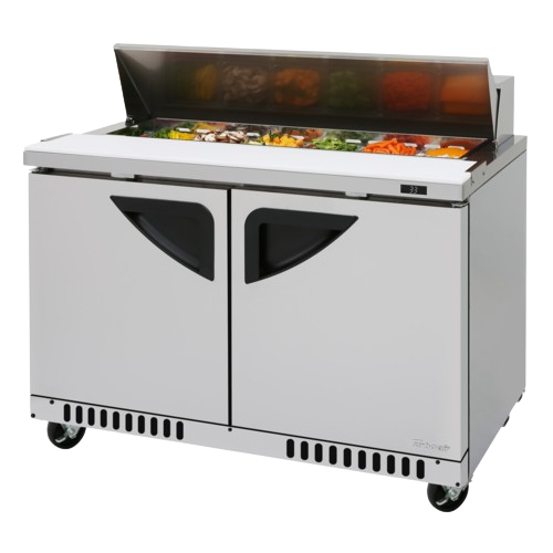 Description: Super Deluxe Sandwich/Salad Unit, Front Breathing airflow, two-section, 11.1 cu. ft., 48-1/4"W x 30"D x 37"H, stainless steel top with 12-pan opening, (2) stainless steel doors with recessed handles, stainless steel interior & exterior (galvanized steel back & bottom), ABS door liner, (2) stainless steel wire shelving, self-cleaning condenser equipped, cold air compartment, insulated pan cover, cutting board side rail, hot gas condensate system, self-contained rear mounted refrigeration system, R290 Hydrocarbon refrigerant, 1/3 HP, 115v/60/1-ph, 4.4 amps, NEMA 5-15P, cETLus, ETL-Sanitation (contact sales for lead time)