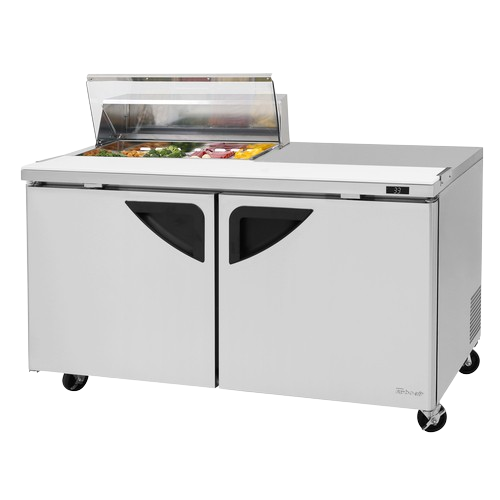 Description: Super Deluxe Sandwich/Salad Unit, two-section, 19.0 cu. ft., clear top with 8-pan opening, (2) stainless steel doors with recessed handles, ABS door liner, (2) stainless steel shelves, cold air compartment, 9-1/2"D cutting board, digital temperature control & monitoring system, LED interior lighting & fan control, stainless steel interior & exterior (galvanized steel back & bottom), 5-3/8"H casters, self-cleaning condenser equipped, R290 Hydrocarbon refrigerant, 1/5 HP, 115v/60/1-ph, 8.9 amps, cord, NEMA 5-15P, cETLus, ETL-Sanitation, Made in USA (allow 4 weeks lead time)