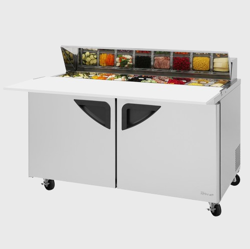 Description: Super Deluxe Sandwich/Salad Unit, two-section, 16.0 cu. ft., stainless steel top with 16-pan opening, (2) stainless steel doors with recessed handles, stainless steel interior & exterior (galvanized steel back & bottom), ABS door liner, (2) stainless steel wire shelving, self-cleaning condenser equipped, cold air compartment, insulated pan cover, 17" deep cutting board, hot gas condensate system, self-contained rear mounted refrigeration system, R290 Hydrocarbon refrigerant, 1/3 HP, 115v/60/1-ph, 4.4 amps, NEMA 5-15P, cETLus, ETL-Sanitation