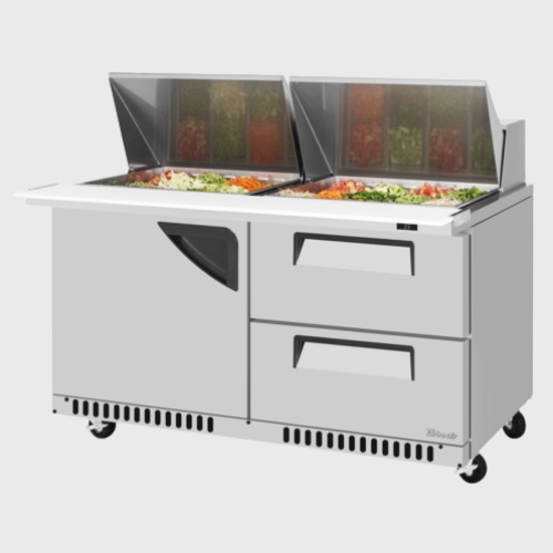 Description: Super Deluxe Sandwich/Salad Mega Top Unit, Front Breathing airflow, two-section, 14.8 cu. ft., 60-1/4"W x 34"D x 39"H, stainless steel top with 24-pan opening, (1) solid hinged swing door with lock, (2) drawers, stainless steel interior & exterior (galvanized steel back & bottom), self-cleaning condenser equipped, cutting board side rail, R290 Hydrocarbon refrigerant, 1/5 HP, 115v/60/1-ph, 8.9 amps, NEMA 5-15P, cETLus, ETL-Sanitation (contact sales for lead time)