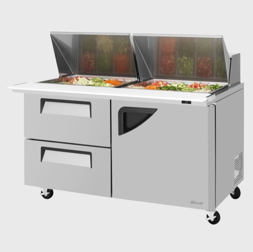 Description: Super Deluxe Sandwich/Salad Mega Top Unit, two-section, 60-1/4"W x 34"D x 39"H, 19 cu. ft., stainless steel top with 24-pan opening, (2) drawers on left, (1) right hinged door on right, stainless steel interior & exterior (galvanized steel back & bottom), ABS door liner, (1) stainless steel wire shelving, LED interior lighting, self-cleaning condenser equipped, cold air compartment, insulated pan cover, cutting board side rail, self-contained rear mounted refrigeration system, R290 Hydrocarbon refrigerant, 1/5 HP, 115v/60/1-ph, 8.9 amps, NEMA 5-15P, cETLus, ETL-Sanitation (contact sales for lead time)