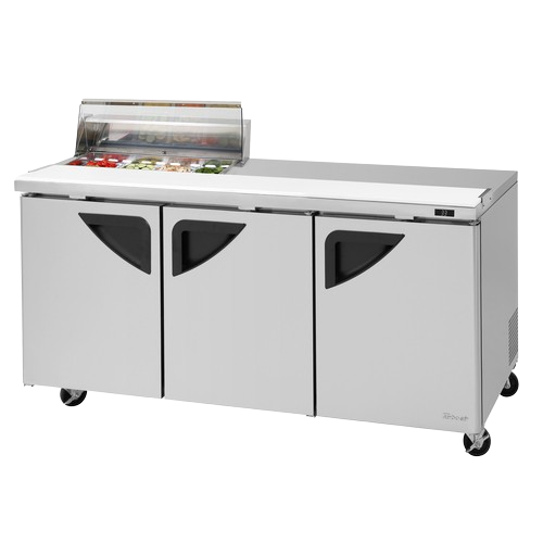 Description: Super Deluxe Sandwich/Salad Unit, three-section, 72-5/8"W x 30"D x 37-5/8"H, 23 cu. ft., clear top with 8-pan opening, (3) stainless steel doors with recessed handles, ABS door liner, (3) stainless steel shelves, cold air compartment, 9-1/2"D cutting board, digital temperature control & monitoring system, LED interior lighting & fan control, stainless steel interior & exterior (galvanized steel back & bottom), self-cleaning condenser equipped, R290 Hydrocarbon refrigerant, 3/8 HP, 115v/60/1-ph, 9.9 amps, cord, NEMA 5-15P, cETLus, ETL-Sanitation, Made in USA (contact sales for lead time)