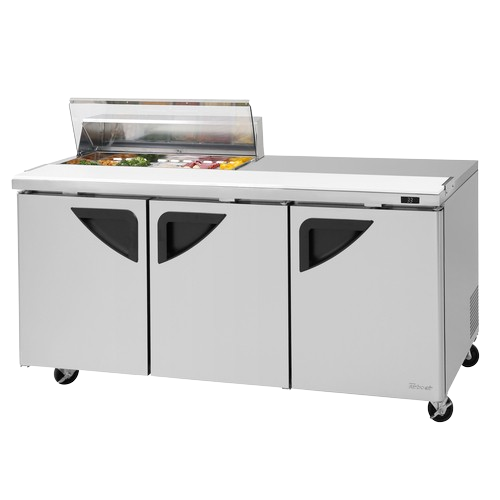 Description: Super Deluxe Sandwich/Salad Unit, three-section, 72-5/8"W x 30"D x 37-5/8"H, 23.0 cu. ft., stainless steel top with 12-pan opening, (3) stainless steel doors with recessed handles, ABS door liner, (3) stainless steel shelves, cold air compartment, insulated pan cover, 9-1/2"D cutting board, digital temperature control & monitoring system, LED interior lighting & fan control, stainless steel interior & exterior (galvanized steel back & bottom) 5-3/8"H casters, self-cleaning condenser equipped, R290 Hydrocarbon refrigerant, 3/8 HP, 115v/60/1-ph, 9.9 amps, NEMA 5-15P, cETLus, ETL-Sanitation, Made in USA (contact sales for lead time)