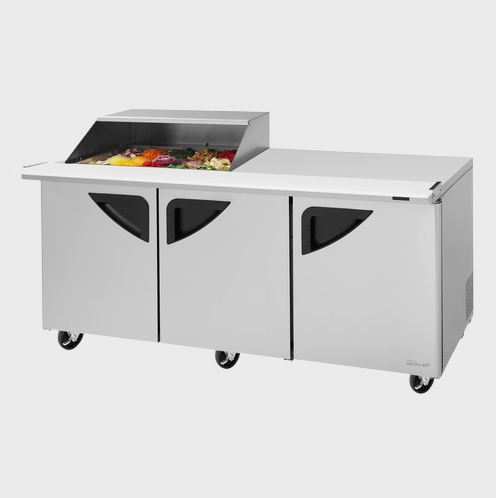 Description: Super Deluxe Sandwich/Salad Mega Prep + Work Station with Slide-Back Lid, specify side of work station, three-section, 23.0 cu. ft., 72-5/8"W x 34"D x 39-5/8"H, (15) 1/6 size x 4" deep pan capacity, (3) stainless steel doors with recessed handles, ABS door liner, (3) stainless steel shelves, cold air compartment, insulated pan cover, 9-1/2"D cutting board, digital temperature control & monitoring system, LED interior lighting & fan control, stainless steel interior & exterior (galvanized steel back & bottom), self-cleaning condenser equipped, R290 Hydrocarbon refrigerant, 3/8 HP, 115v/60/1-ph, 9.9 amps, NEMA 5-15P, cETLus, ETL-Sanitation, Made in USA (Contact sales for lead time)