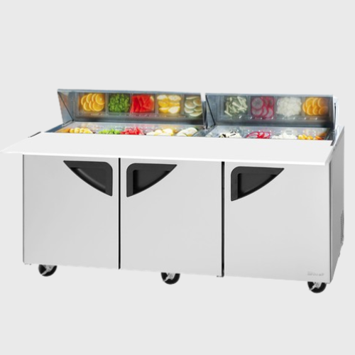 Description: Super Deluxe Sandwich/Salad Unit, three-section, 23 cu. ft., 72-5/8"W x 34"D x 37-5/8"H, stainless steel top with 18-pan opening, (3) stainless steel doors with recess handles, stainless steel interior & exterior (galvanized steel back & bottom), ABS door liner, LED interior lighting, (3) stainless steel wire shelving, self-cleaning condenser equipped, cold bunker system, insulated pan cover, 17" deep cutting board with side rail, self-contained rear mounted refrigeration system, R290 Hydrocarbon refrigerant, 3/8 HP, 115v/60/1-ph, 9.9 amps, NEMA 5-15P, cETLus, ETL-Sanitation (contact sales for lead time)