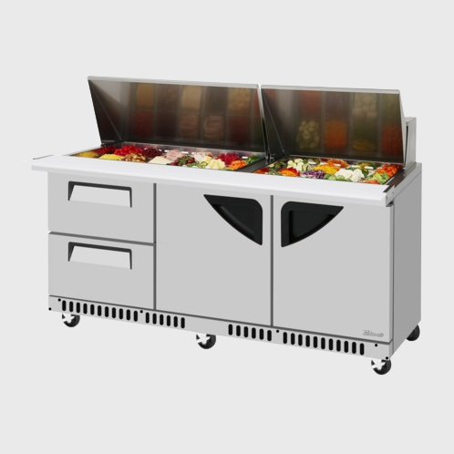 Description: Super Deluxe Sandwich/Salad Mega Top Unit, Front Breathing airflow, three-section, 17.6 cu. ft., 72-5/8"W x 34"D x 39"H, stainless steel top with 30-pan opening, (2) drawers, (2) doors, stainless steel interior & exterior (galvanized steel back & bottom), self-cleaning condenser equipped, cutting board side rail, R290 Hydrocarbon refrigerant, 3/8 HP, 115v/60/1-ph, 9.9 amps, NEMA 5-15P, cETLus, ETL-Sanitation (contact sales for lead time)