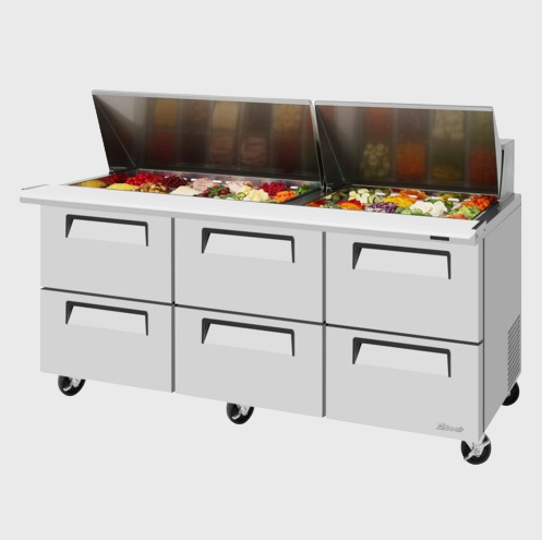 Description: Super Deluxe Sandwich/Salad Mega Top Unit, Front Breathing airflow, three-section, 23 cu. ft., 72-5/8″W x 34″D x 39-5/8″H, stainless steel top with 30-pan opening, (6) drawers, stainless steel interior & exterior (galvanized steel back & bottom), self-cleaning condenser equipped, cutting board side rail, R290 Hydrocarbon refrigerant, 3/8 HP, 115v/60/1-ph, 9.9 amps, NEMA 5-15P, cETLus, ETL-Sanitation (contact sales for lead time)