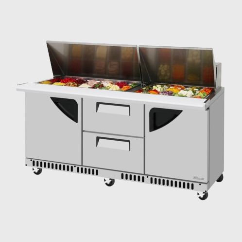 Description: Super Deluxe Sandwich/Salad Mega Top Unit, Front Breathing airflow, three-section, 17.6 cu. ft., 72-5/8"W x 34"D x 39"H, stainless steel top with 30-pan opening, (2) drawers, (2) doors, stainless steel interior & exterior (galvanized steel back & bottom), self-cleaning condenser equipped, cutting board side rail, R290 Hydrocarbon refrigerant, 3/8 HP, 115v/60/1-ph, 9.9 amps, NEMA 5-15P, cETLus, ETL-Sanitation (contact sales for lead time)