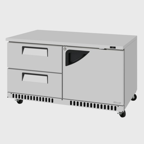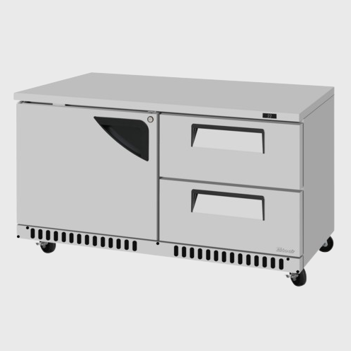 Description: Super Deluxe Series Undercounter Refrigerator, Front Breathing airflow, two-section, 14.8 cu. ft., 60-1/4"W x 30"D x 30"H, (1) solid hinged swing door with lock, (2) drawers, (1) stainless steel wire shelf, stainless steel interior & exterior (galvanized steel back & bottom), self-cleaning condenser equipped, R290 Hydrocarbon refrigerant, 1/5 HP, 115v/60/1-ph, 8.9 amps, NEMA 5-15P, cETLus, ETL-Sanitation (contact sales for lead time)