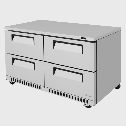 Description: Super Deluxe Series Undercounter Refrigerator, front breathing airflow, two-section, 14.8 cu. ft., 60-1/4"W x 30"D x 30"H, (4) drawers, stainless steel interior & exterior (galvanized steel back & bottom), self-cleaning condenser equipped, R290 Hydrocarbon refrigerant, 1/5 HP, 115v/60/1-ph, 8.9 amps, NEMA 5-15P, cETLus, ETL-Sanitation (contact sales for lead time)