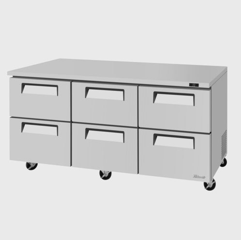 Description: Super Deluxe Series Undercounter Refrigerator, front breathing airflow, three-section, 18.8 cu. ft., 72-5/8"W x 30"D x 30"H, (6) drawers, stainless steel interior & exterior (galvanized steel back & bottom), self-cleaning condenser equipped, R290 Hydrocarbon refrigerant, 1/6 HP, 115v/60/1-ph, 6.5 amps, NEMA 5-15P, cETLus, ETL-Sanitation (contact sales for lead time)