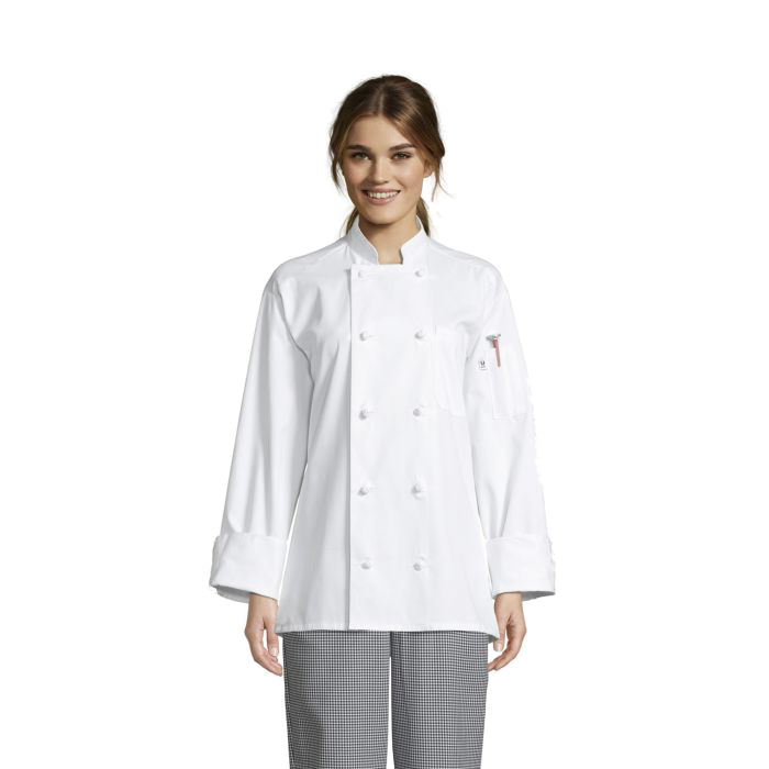Description: Classic Knot Chef Coat, unisex, long sleeve, (10) white knot buttons, (1) mitered breast pocket, (1) thermometer pocket, finished cuff & collar, reversible closure, reinforced bar tacking, 65/35 poly/cotton twill, 7.5 oz., white